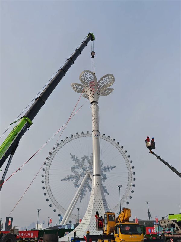 经过两个月紧张而充分的准备工作,火炬塔第一车零件于去年11月30日晚准时按计划运抵哈市。12月19日顺利完成5个花瓣的整体吊装,完成火炬塔最后一道重要工序。12月25日,随着火炬塔试点火一次成功,此时的“雪韵丁香”已经为亚冬会完全做好了准备。