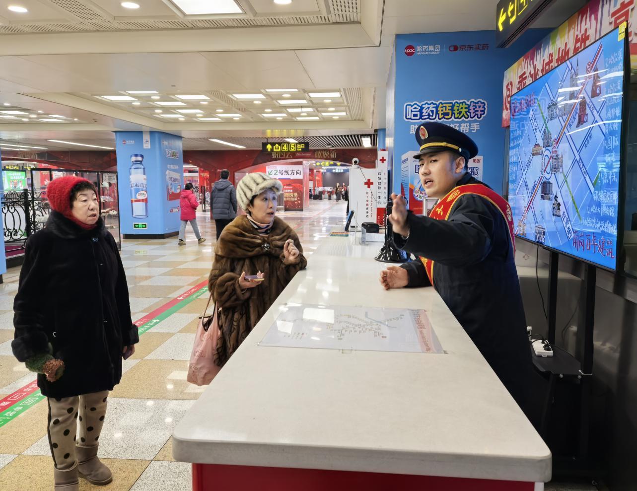 推出“服务+”,温馨乘客每一程。地铁集团更是将贴心服务做到了极致,在车站开展“导游式服务”,每天在车站为外地游客提供车站周边旅游景点、宾馆、酒店、公共交通等咨询服务;在旅游景点地铁车站电子信息屏上,增设了“冰雪旅游乘客服务指南”,车站周边旅游景点、公交线路、酒店住宿等信息,让乘客一看便知。“套餐式服务”,在各地铁车站的客服中心显著位置增设了“市民服务热线电话”,为旅游团队提供预约服务。通过拨打服务热线,可以提前预订车票并安排指定时间和指定车站领取车票,享受专用通道。“爱心预约服务”,在车站客服中心都设立了爱心预约电话,为残疾人和行动不便的老年人,提供进站、购票、乘车、出站“全程式”服务。“志愿者服务”则以“一对一、点对点”的方式,满足乘客的各类需求,无论是扶老携幼、爱心救助还是问题咨询,志愿者们都倾尽全力,让每一位乘客都能感受到地铁的温馨与关怀。