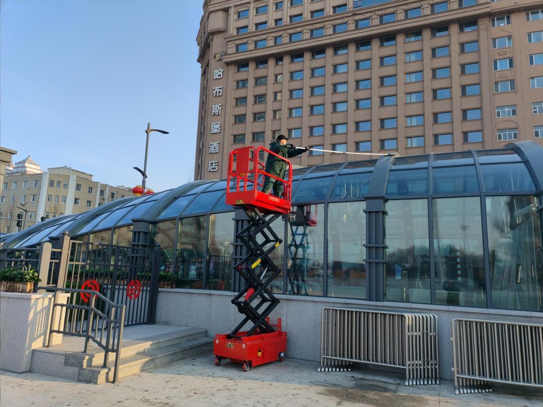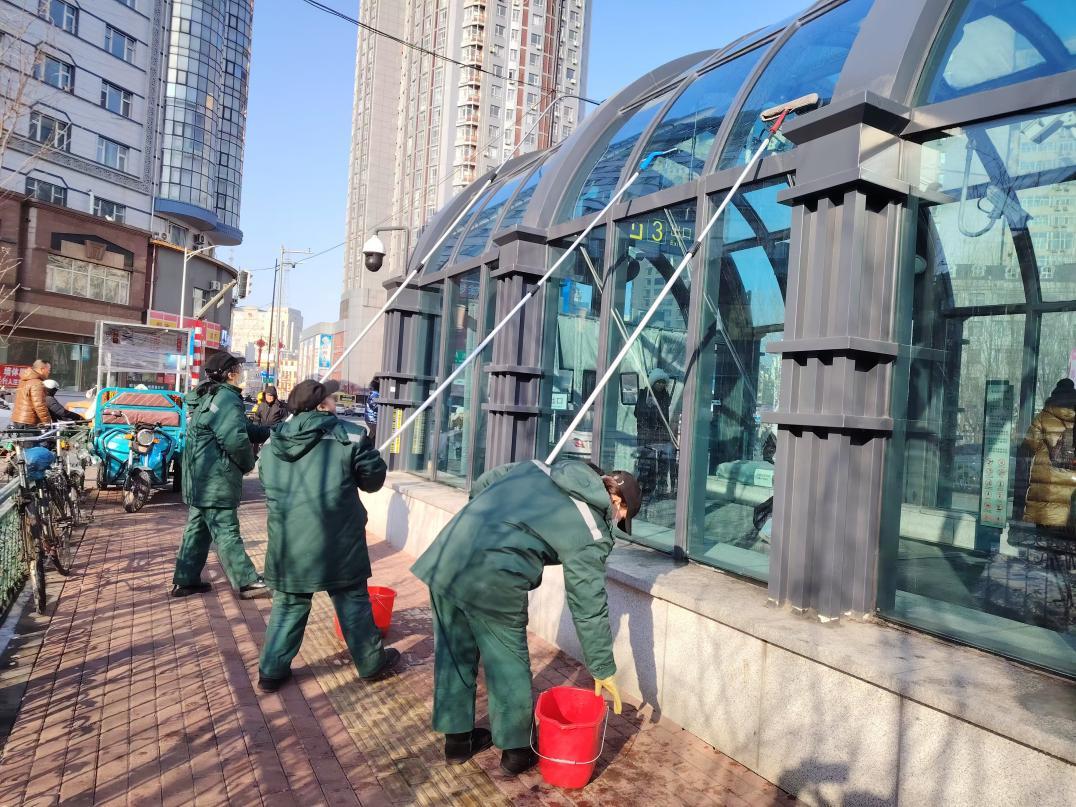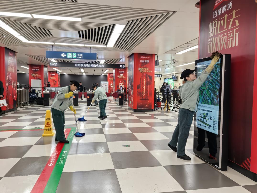 推出“环境+”,让您出行更舒心。为给中外游客创造良好出行环境,地铁物业公司推进“迎亚冬、净设施”城市侧保障专项清洁行动,组织成立了64支保洁队伍,出动2500余人次,连续奋战十余天对78座车站的255个出入口罩棚上的积雪和冰溜子进行清理,同时,用热水进行洗刷,焕然一新的玻璃罩棚透明瓦亮。每天组织200余人,对车站内地面、电扶梯、直梯、出入口通道、安全门、卫生间等进行不间断的擦拭,同时,对每天回车辆段的70余辆列车进行全方位清洗保洁,保证乘客们每日都能坐上最干净的地铁,很多外国游客称赞“这里是最干净的地铁”。