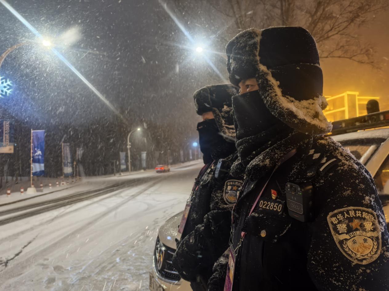 在雪花纷飞的亚布力,赛场周边民警正在开展巡逻防控工作。作为亚冬会雪上赛事主要举办地,这里的安全防范至关重要,一刻不容闪失。