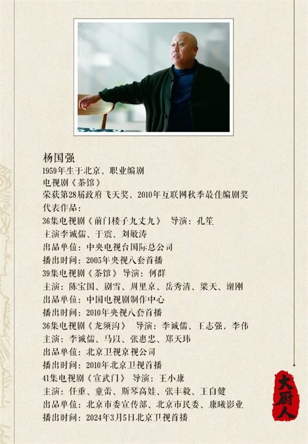 作为职业编剧,杨国强有着丰富的创作经验,其多部编剧作品如电视剧《茶馆》《前门楼子九丈九》《龙须沟》《宣武门》等都深受观众喜爱。此次《大厨人》电视剧的策划运作,也让众多读者和观众对这部作品搬上荧幕充满期待。