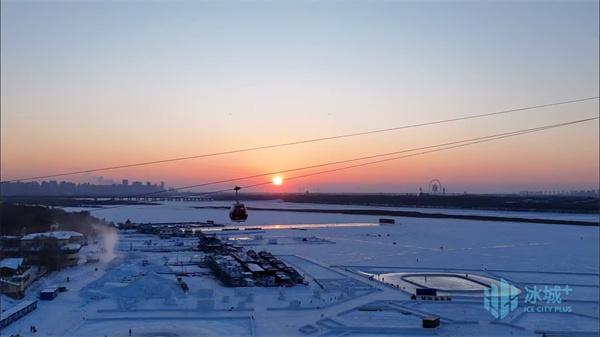冬季的松花江日落被誉为“不可复制的浪漫”。当夕阳西沉,索道轿厢宛如悬于天际的观景台,金红色的余晖倾泻而下,将冰封的江面染成一片流动的琥珀。远处的中东铁路桥在暮色中化作一道剪影,与江畔晶莹的雾凇相映成趣;冰雪大世界的灯光渐次亮起,如同繁星坠入人间,与天际残霞交织成梦幻的光带。游客倚窗而立,耳畔是轿厢滑行的轻微嗡鸣,眼前是光影在冰面上跳跃的瞬息万变,仿佛穿梭于现实与童话的边界。这一刻的松花江,既是自然的壮阔诗篇,亦是冰雪季独有的温柔馈赠。