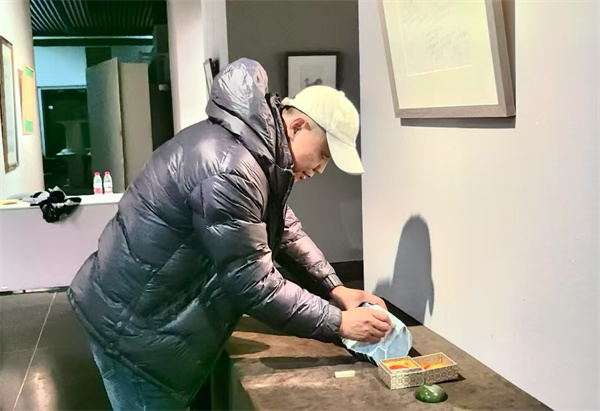 2020年,蔡醒善被调到省版画院。近年来,蔡醒善从哈尔滨的历史文化和城市景观中寻找创作灵感,方向进一步调整,观念进一步更新,创作了一系列新作品。在第九届亚冬会前夕,很多城市改造项目开始施工,省版画院附近的老旧小区就在其中。蔡醒善每天都到现场观察,看着密密的脚手架和防护网,吊在半空中的工人……施工场面唤醒了他以往的怀旧情结和创作热情,于是他创作了表现旧楼改造的《复华四道街》。哈尔滨的旅游爆火,蔡醒善作为一个新哈尔滨人,也倍感哈尔滨冬天的火热和这座城市的魅力。在这样情感的激发下,他创作了表现哈尔滨冰、雪雕施工热烈场面的作品《尔滨·舞冬》。这两件作品分别入选了“第25届全国版画展”和“第14届全国美展”。这些作品比之前更流畅,体现了成熟的画面把控能力,标志着其艺术转型的成功。
