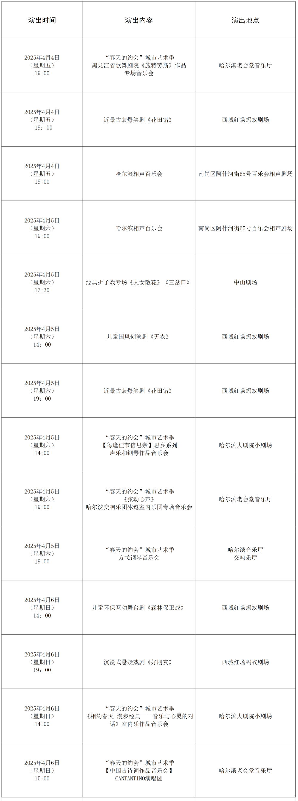 清明假期演出时刻表