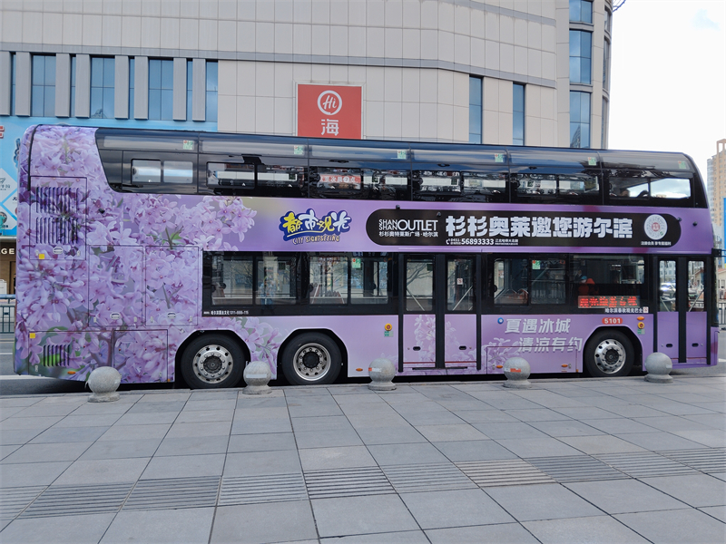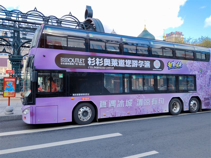 “五一”将近,丁香花开,以往火红的双层观光巴士也披上了紫色丁香花的外衣,穿梭在市区主要景点,在带领市民、游客欣赏城市景色的同时,作为城市流动展厅,展示着哈尔滨的春意盎然,为迷人的哈尔滨之夏助力。