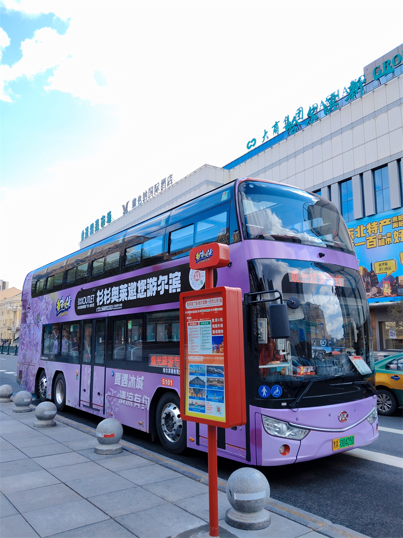 不仅车身散发着丁香花的气息,观光巴士车内配备的解说系统,让乘客在每一站到站时,可以听到关于景点的讲解。此时车辆便成为城市的流动展厅,让更多市民、游客了解哈尔滨的悠久历史。