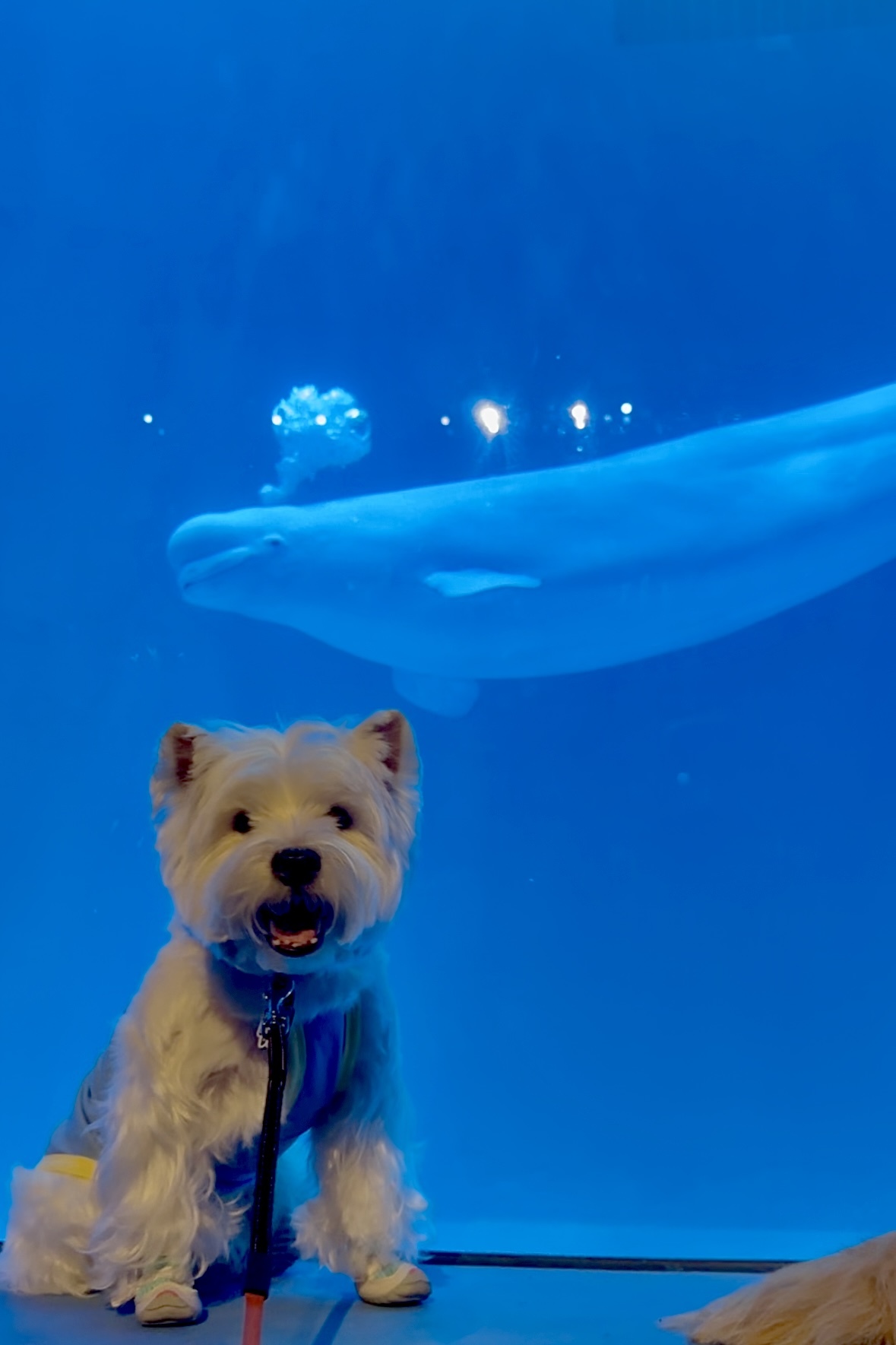活动现场亮点纷呈。网红萌宠们身着可爱定制服饰,带来精彩的时装走秀与才艺表演。白鲸剧场特别开启“影院模式”,主人携萌宠共同观赏了曾获评“全球50大历史时刻”的世界首创极地白鲸水下表演“海洋之心”。萌宠们通过叫声、动作等独特方式回应,表演与白鲸开启隔空“交友”。萌宠团队还畅游极地公园,在火爆全网的“摩洛哥蓝色小镇”、1:1比例复刻的意大利阿尔贝罗贝洛“蘑菇小镇”以及冰川王座等热门打卡景观拍摄专属大片,定格人宠同乐的美好瞬间。