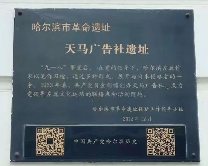 李粤介绍说,由于金剑啸“有才华,有名气,还是上海回来的”,他创办的天马广告社在当时的哈尔滨和一些电影院、商店、外国洋行,都有业务来往,还为中央大街画装饰画。这里是我党与东北抗联的一处秘密联络点。