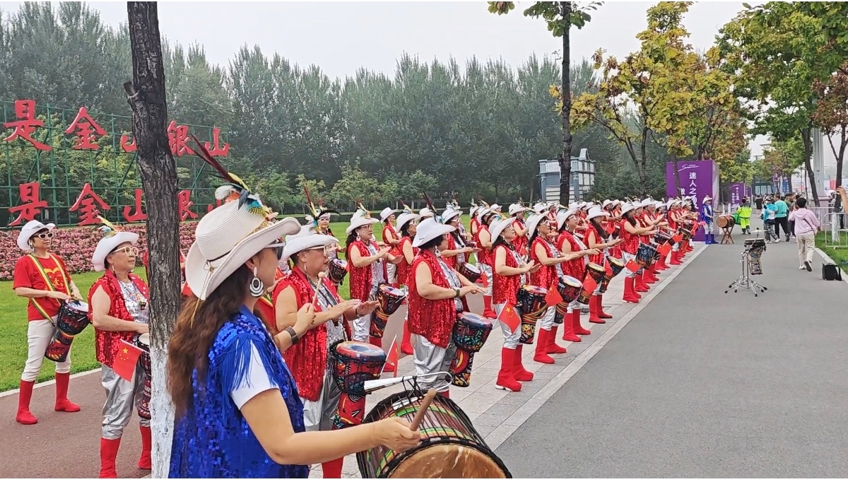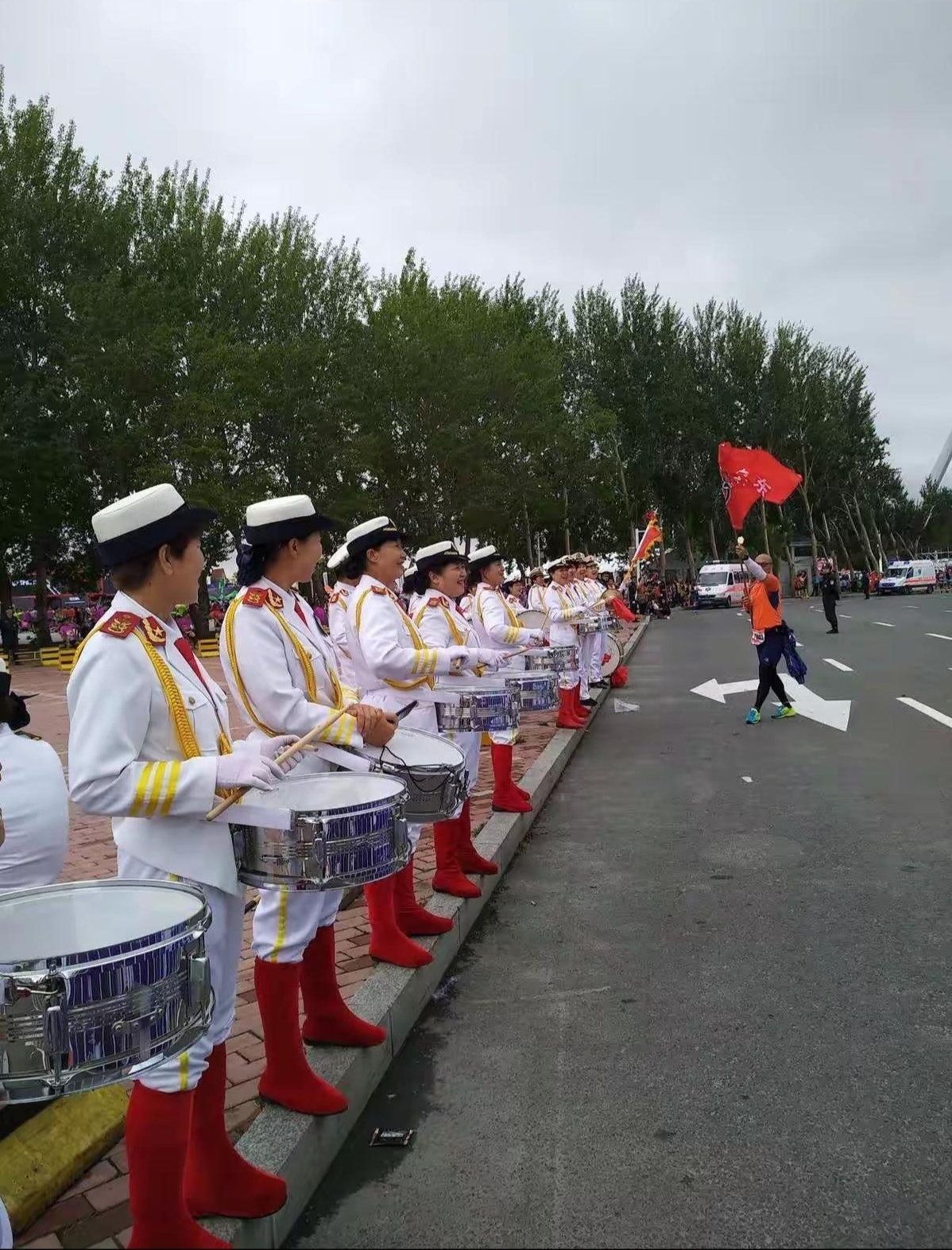 随着发令枪鸣响,由哈尔滨市广场舞健身协会金秋非洲鼓带来的《战马》和赛道冰雪大世界转弯处来自建国社区军鼓乐队《运动员进行曲》一起启动,这是该社团第六次登上“哈马”起点赛道氛围营造。