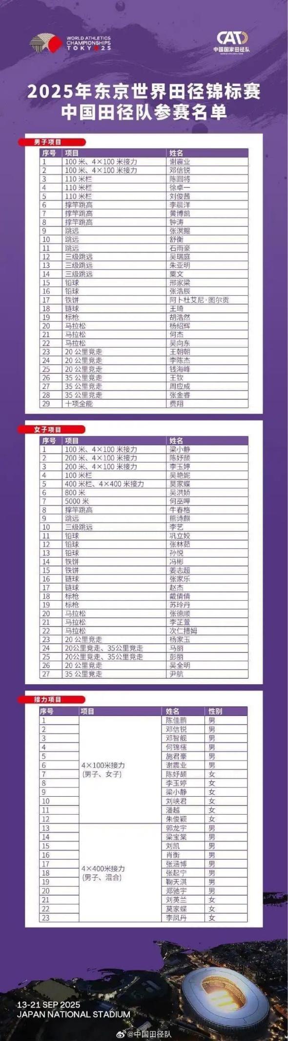 2025年世界田径锦标赛将于9月13日至9月21日在日本东京举行。中国田径队将派出73名运动员(男运动员41人、女运动员32人),参与33个小项的比拼。黑龙江运动员钱海峰、郭龙宇位列其中。