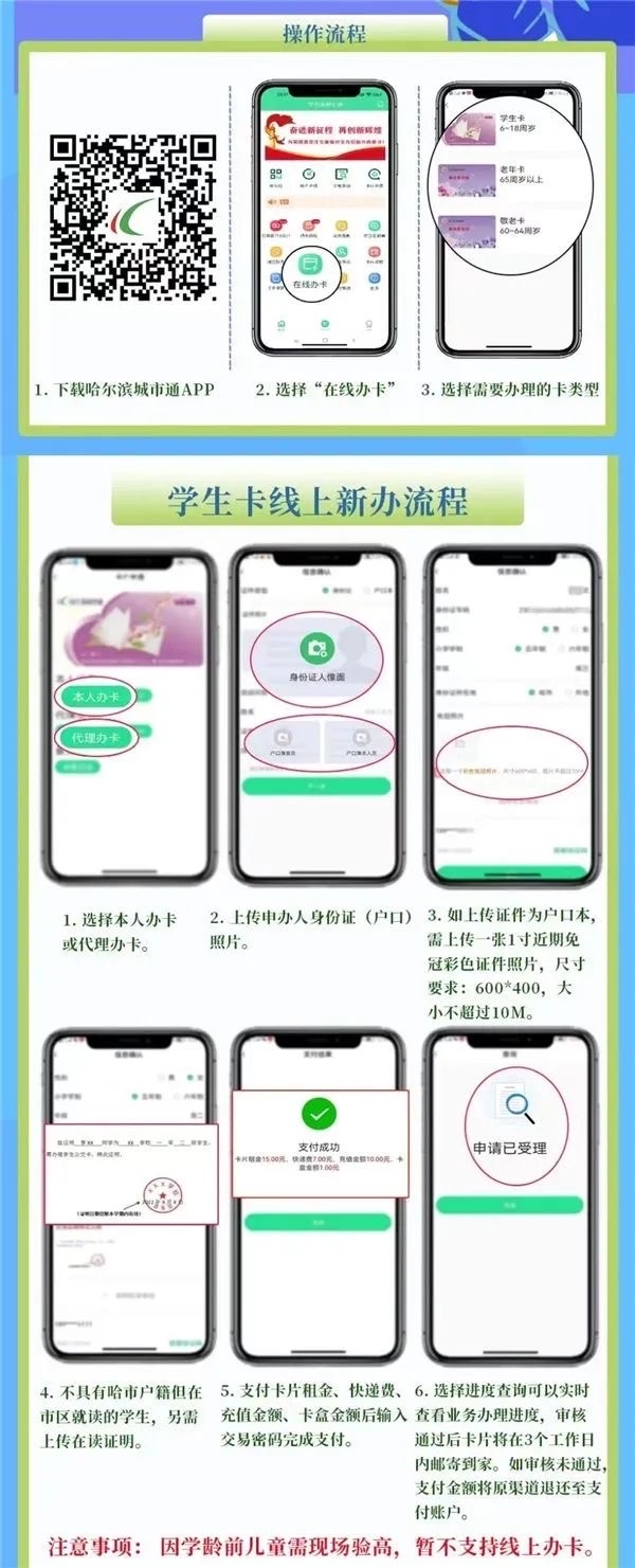 近期,前往城市通网点办理新开学生卡的用户增多,主要为初一及高一年级新生。城市通智能卡公司提醒,目前新开学生卡可以全程线上进行办理。需要办理新卡的学生,可以在“哈尔滨城市通”APP内,选择本人办卡或代理办卡,上传申办人身份证(户口簿)照片。不具有哈市户籍但在市区就读的学生,另须上传在读证明。在读证明须由哈尔滨市教育局批准成立的全日制小学、初中和高中负责学生德育工作的管理部门(政教处或教导处)开具,证明内容需包括学生姓名、所在年级、班级和证明开具日期,并由开具部门加盖公章。在读证明填写时应使用蓝、蓝黑、黑色钢笔或碳素笔(用铅笔、圆珠笔填写无效,涂改无效),在读证明于本学期内有效。