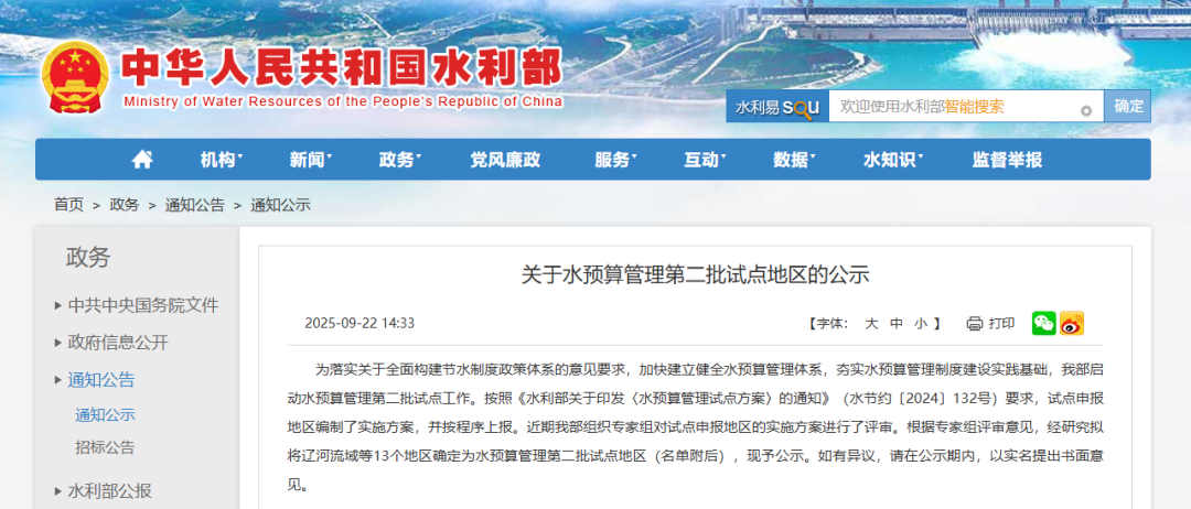 近日,水利部印发《关于水预算管理第二批试点地区的公示》,经研究拟将13个地区确定为水预算管理第二批试点地区。其中,黑龙江1地入选。