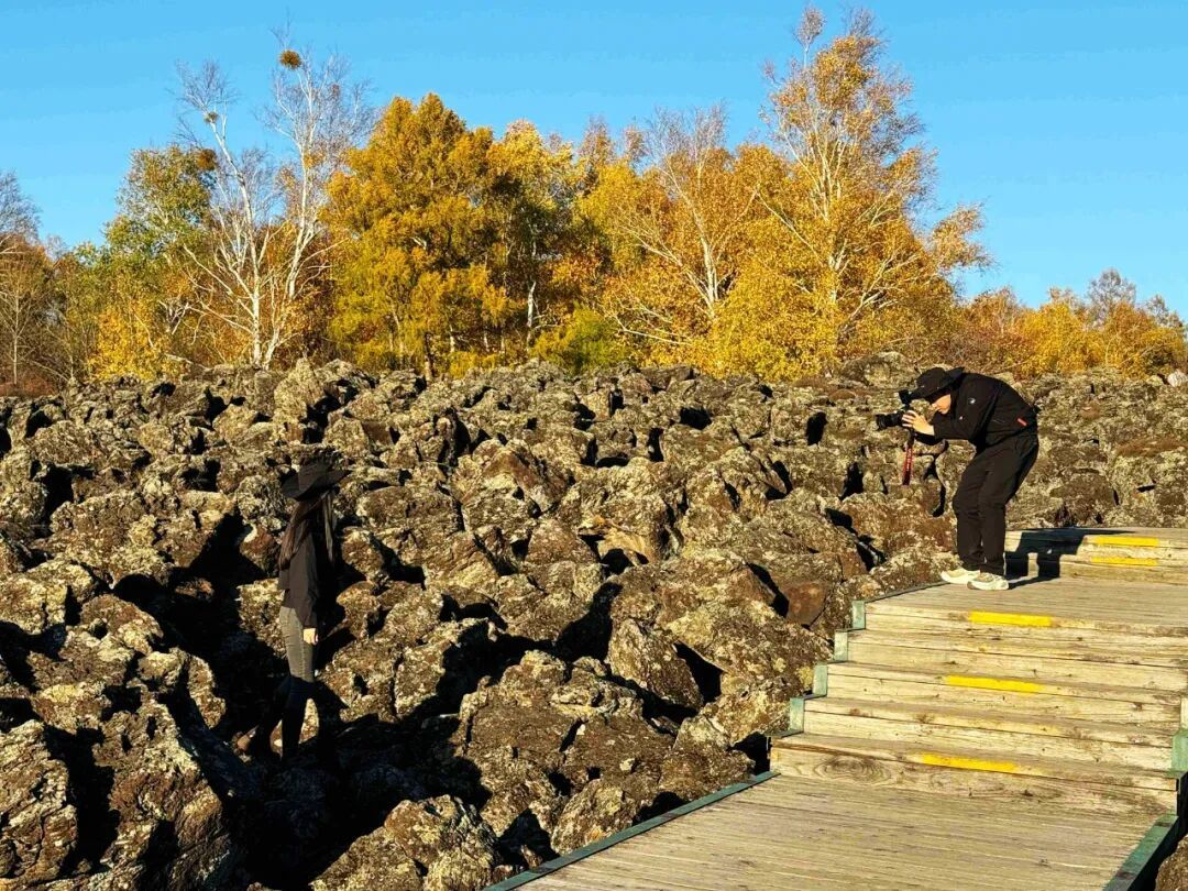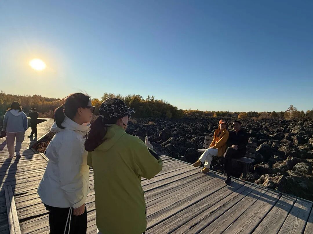 更年轻的旅行者正用新视角记录这片土地。来自新疆的大学生毕云添和同伴操纵无人机掠过药泉山巅,镜头里赭红色的火山锥与碧玉般的温泊构成几何美学。“从西北到东北,我们在这片辽阔国土上感受着祖国的脉动。”年轻人将秋日盛景实时传送到千里之外的家乡。