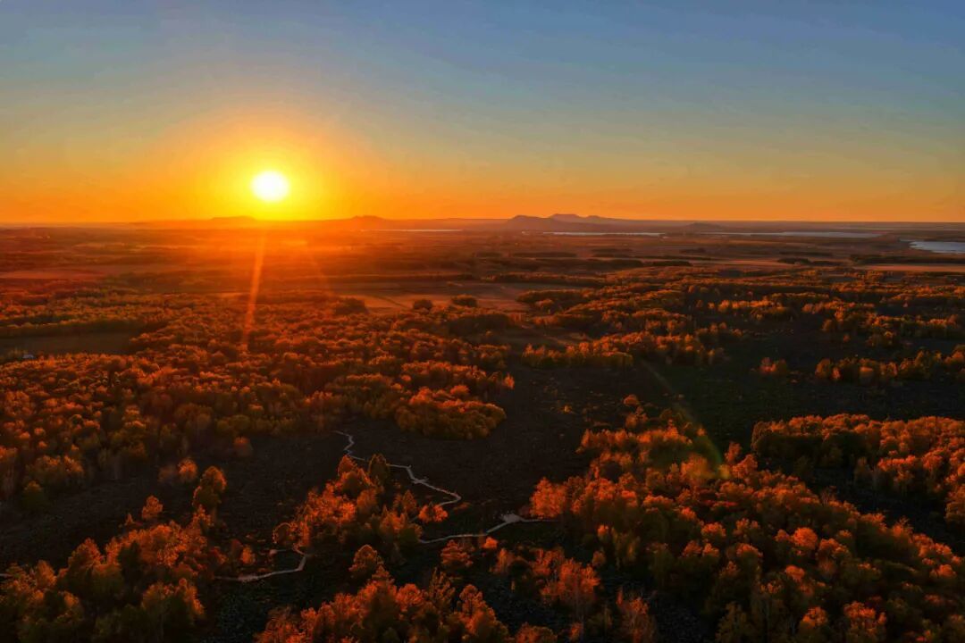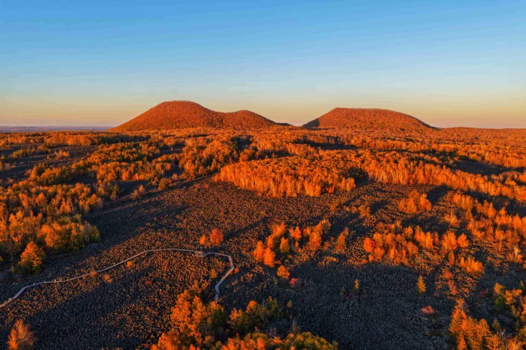 秋风吹过万年凝固的熔岩,为五大连池披上流光溢彩的霞衣。红枫似火、白桦鎏金、绿松凝翠、玄岩沉静,这些色彩在火山群间层层晕染,与湛蓝的堰塞湖相映成画。当中秋的月华浸润着国庆的欢腾,这座世界地质公园正演绎着天地间最动人的相遇。