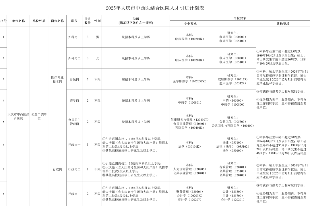 3.专业要求。具体岗位所需专业见《2025年大庆市中西医结合医院人才引进计划表》(附件1)。