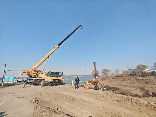 在音达木河跨线桥项目建设现场,工人们正利用打桩设备进行桥桩基础施工,按设计点位精准打孔,之后将灌注混凝土形成16根桥桩,为后续构建桥梁承台奠定基础。