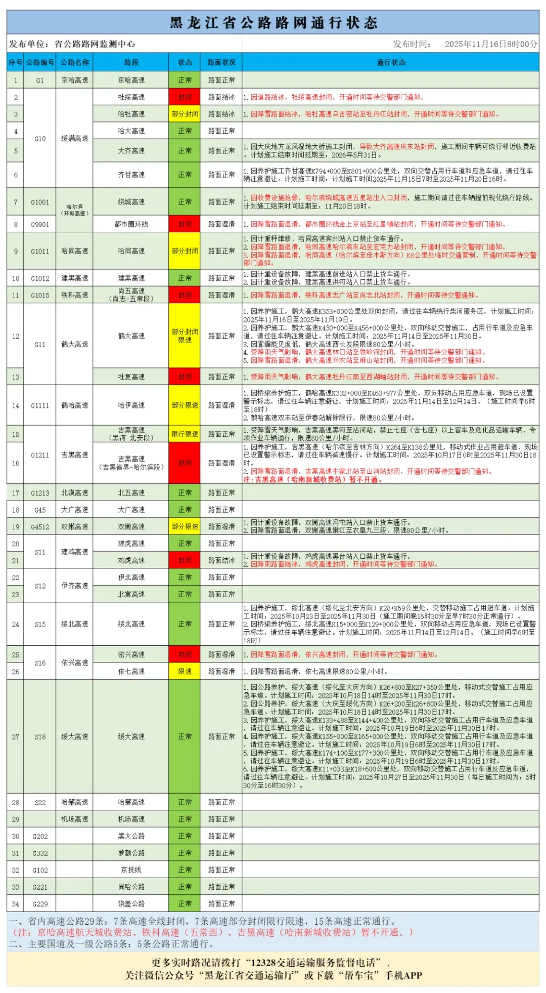 11月16日8时汇总路况信息:全线封闭的高速有(7条高速):鸡虎高速、密兴高速、都市圈环线、铁科高速、牡绥高速、牡复高速、吉黑高速(吉黑省界-哈尔滨站),封闭。部分封闭限速限行的高速有(7条高速):1.鹤哈高速(双丰站至伊春站)、依七高速、鹤大高速(西长发站)、双嫩高速(嫩江至农垦九三站),限速80公里/小时。2.吉黑高速(黑河-北安段),禁止七座(含七座)以上客车及危化品运输车辆,专项作业车辆通行,限速80公里/小时。3.哈同高速(哈尔滨东站至宏克力站)、鹤大高速(兴农站至铁岭河站)、哈牡高速(乌吉密站至牡丹江站),封闭。省内其它高速路况正常。