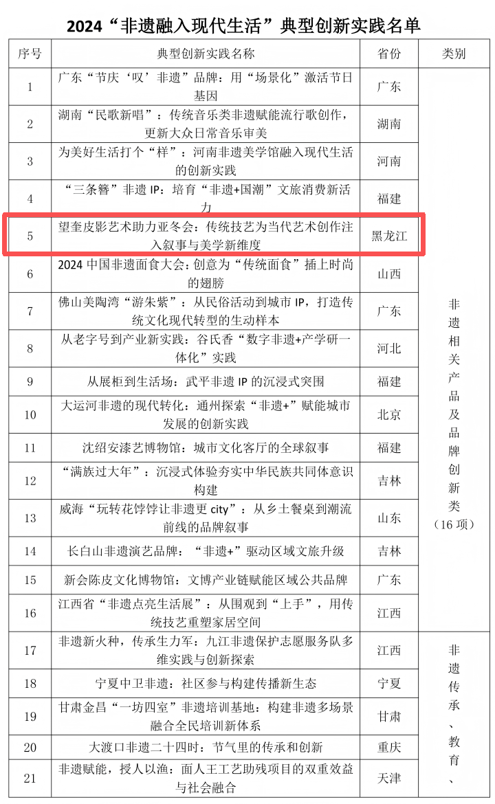 “望奎皮影艺术助力亚冬会:传统技艺为当代艺术创作注入叙事与美学新维度”成为我省唯一入选非遗相关产品及品牌创新类名单。