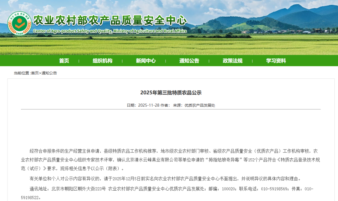 近日,农业农村部农产品质量安全中心公示2025年第三批特质农品。其中,黑龙江1个产品拟入选。