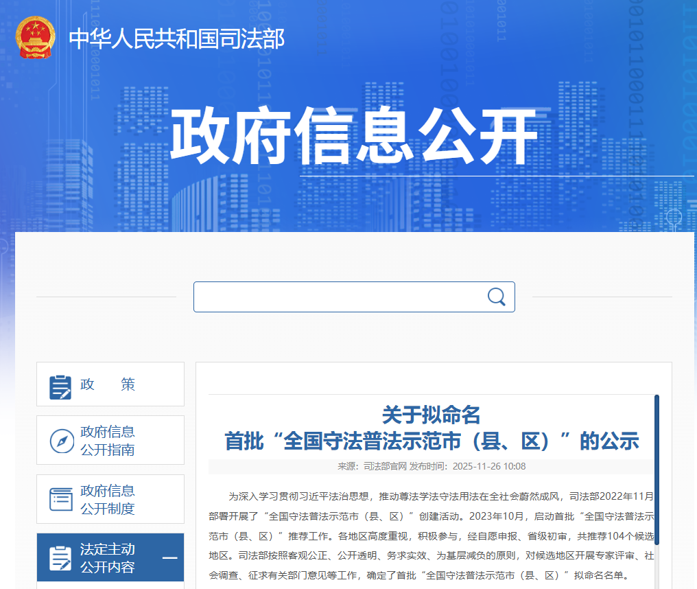 近日,司法部网站发布《关于拟命名首批“全国守法普法示范市(县、区)”的公示》。经自愿申报、省级初审,共推荐104个候选地区。其中,黑龙江2个地区拟入选。