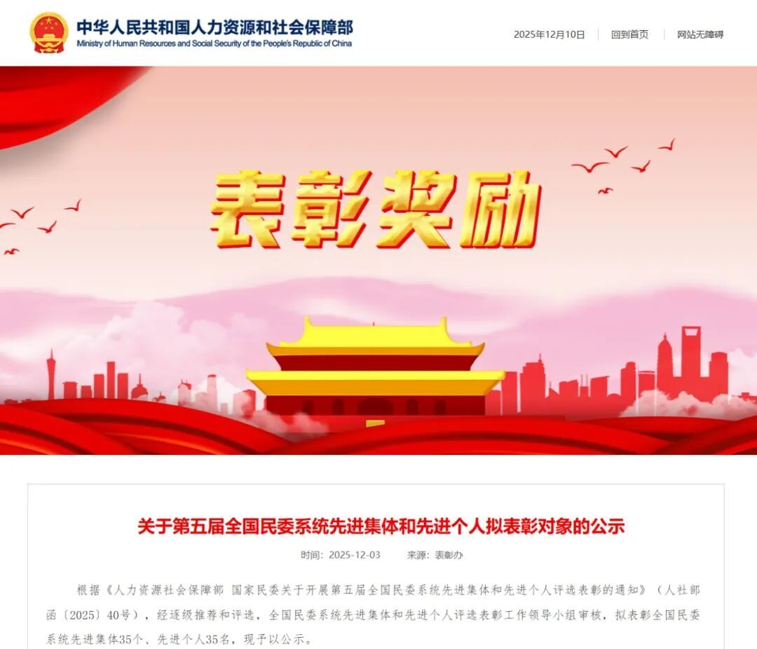 近日,人力资源和社会保障部网站发布《关于第五届全国民委系统先进集体和先进个人拟表彰对象的公示》 。经逐级推荐和评选,全国民委系统先进集体和先进个人评选表彰工作领导小组审核,拟表彰全国民委系统先进集体35个、先进个人35名。 其中,黑龙江1个集体、1名个人入选。