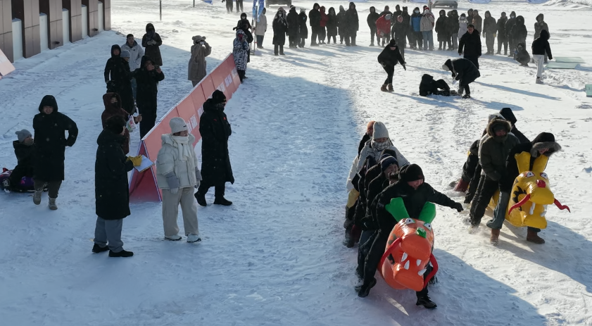 启动仪式后,百余组家庭齐聚赛场,参与冰壶、抽冰尜、冰上滚圈跑、雪地龙舟、雪圈追逐5个趣味项目。冰上博弈显智慧,雪地协作展活力,各项目将竞技性与趣味性结合,让亲子家庭在欢声笑语中感受冰雪魅力,现场氛围热烈。