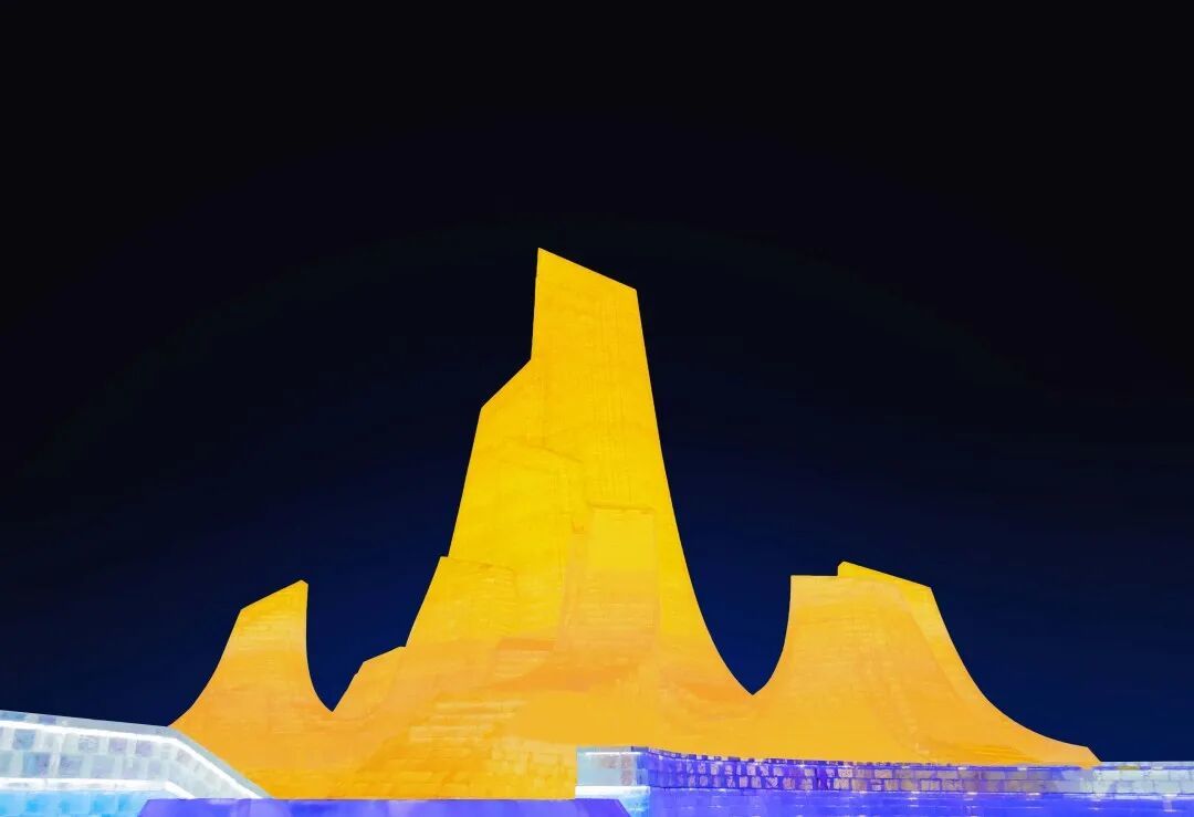 主塔“冰灯启梦”巍然矗立,其形如雪花虔诚托举着一座“山”。