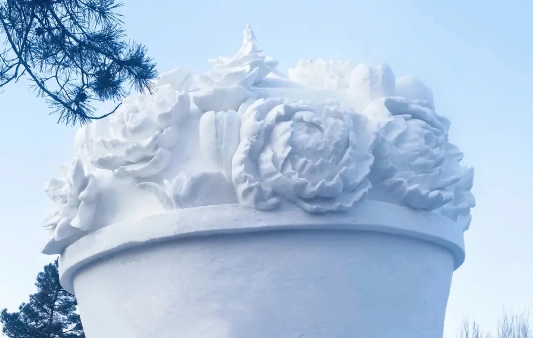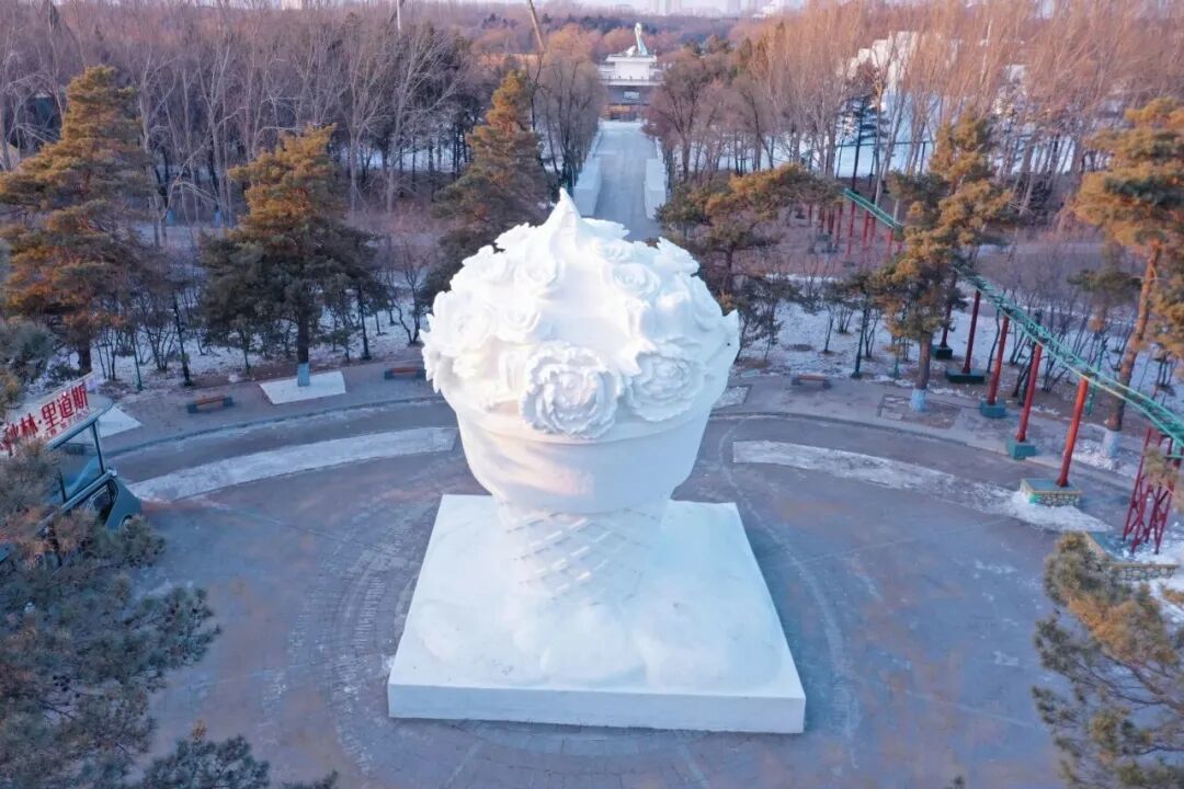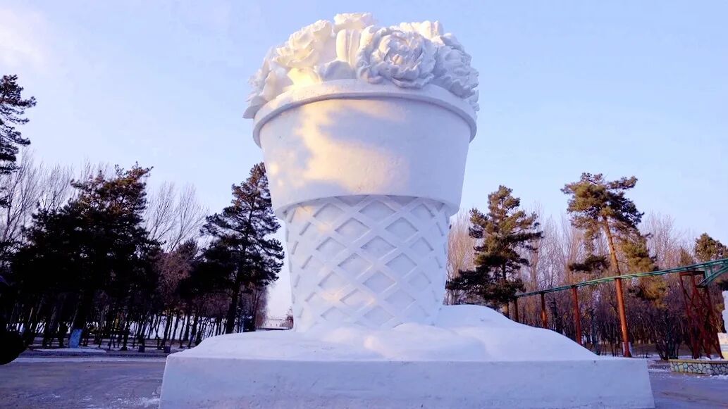 该雪雕以经典甜筒冰淇淋为原型,雪制甜筒部分雕琢出规整细腻的菱格纹路,甜筒内部则是栩栩如生的雪塑繁花。作品打破季节边界,将冰淇淋的童趣、繁花的浪漫与雪的纯净巧妙融合,成为太阳岛冬日景致中格外醒目的存在。