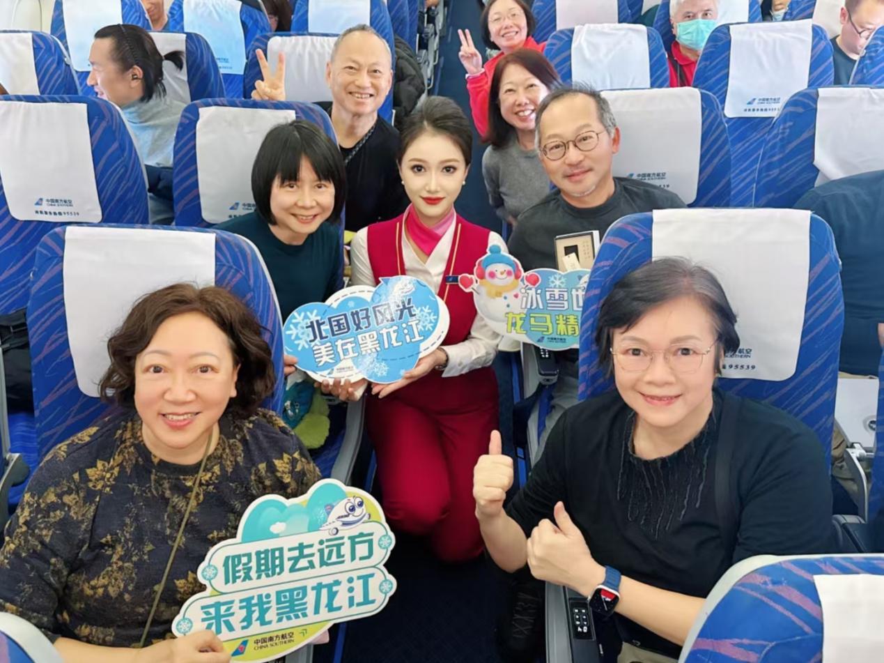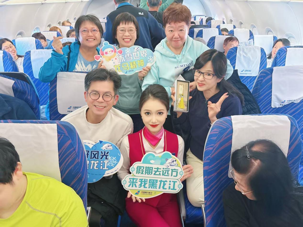 1月4日,黑龙江省文化和旅游厅携手南航黑龙江分公司举办“庆祝第42届中国·哈尔滨国际冰雪节”主题航班活动在香港至哈尔滨CZ6048航班上欢乐开展,百余名香港游客在祖国万米高空与乘务组共庆冰雪盛会的到来。