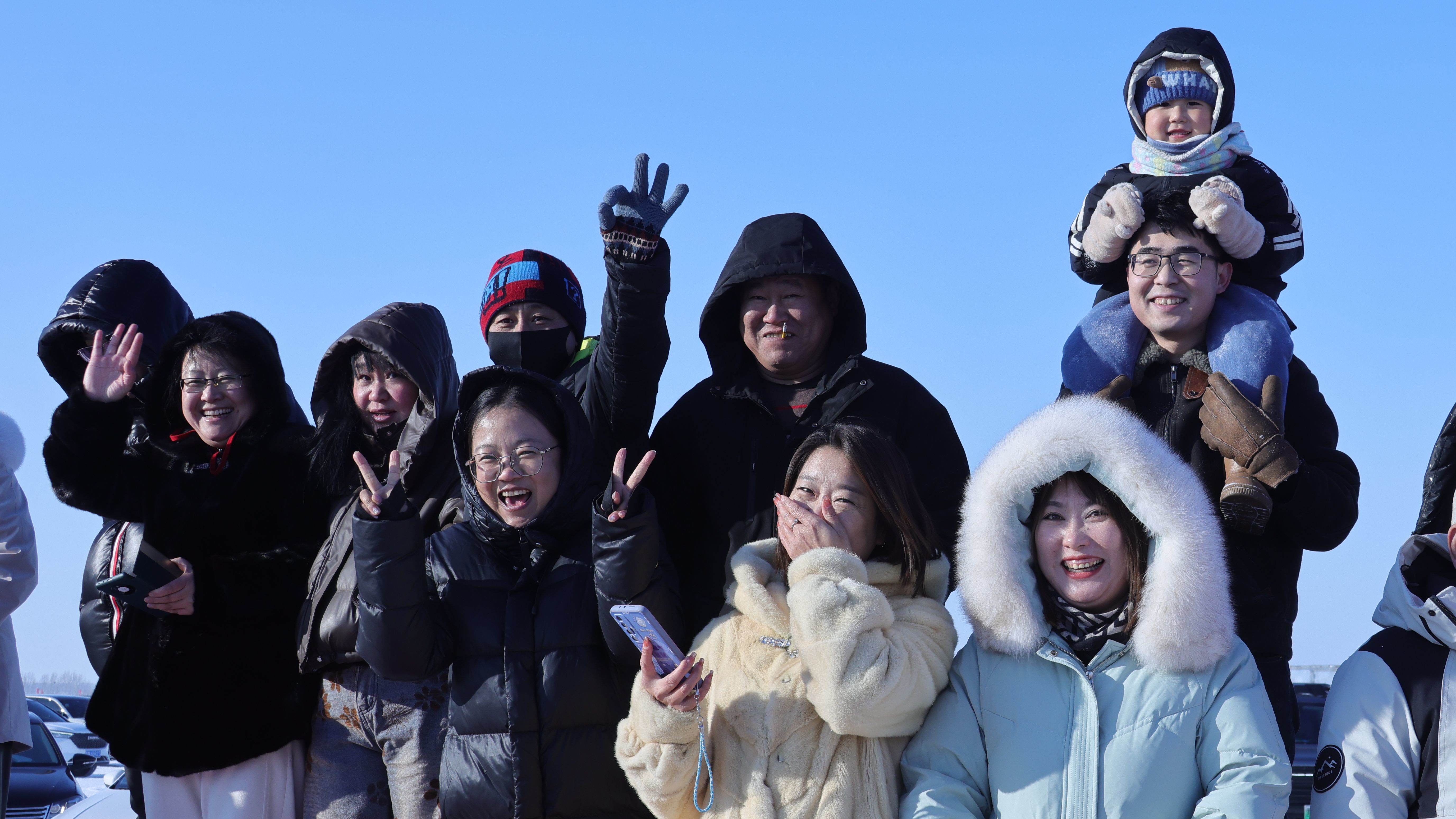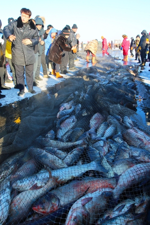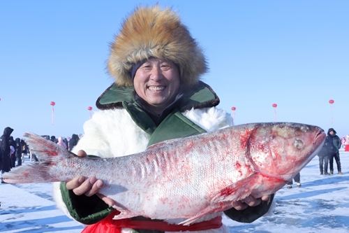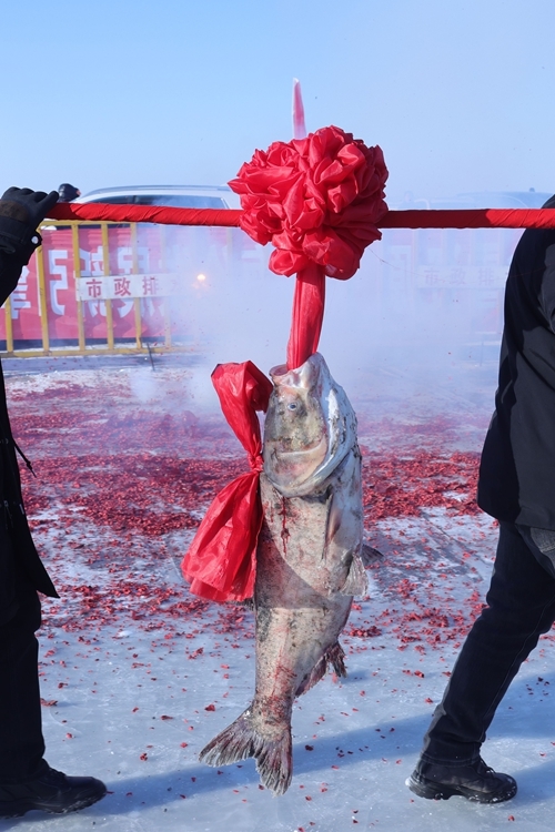 吃饱喝足后,游客们又兴致勃勃地赶往出鱼处,等待下午拉网捕鱼的重头戏。随着“鱼把头”一声高亢的号子,拉网腾鱼环节震撼启幕,捕鱼汉子们默契配合,将百米大网从冰洞徐徐拉出;不一会儿,头鱼跃水而出,游客们纷纷围拢上前,用手机记录这“冰湖腾鱼”的壮观景象。尽管气温低至零下二十多度,但大家的热情丝毫不减,欢呼声、惊叹声此起彼伏,为冬日的冰湖增添了无限生机。两名壮汉合力扛起头鱼,伴随着震天的鞭炮声缓步前行,红火的炮屑在冰面上溅起细碎的烟尘,将现场氛围推向高潮,也让在场的每一位观众在收获与好运的象征中,感受到年年有余、福气满盈的美好祝福和浓浓年味。