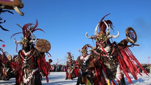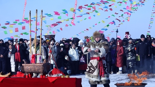 10时30分,启动仪式开始。主舞台在彩旗、彩虹拱门和气球空飘的映衬下显得格外醒目,憨态可掬的雪人雕塑点缀其间,让整个会场充满了喜庆的氛围。祈福仪式随后上演,成为传承非遗文化的重要环节。专业表演团队身着传统服饰,依次开展敬奉五谷、诵读祈福词、跳萨满舞等仪式,将“祭湖醒网”的古老习俗与“探冰图”的传统技艺生动呈现。演员们动作庄重、神情肃穆,表达了对自然的敬畏与感恩,寄托了对来年丰收、百姓安康的美好祝愿。现场观众真切感受到非遗文化的厚重魅力与独特韵味。