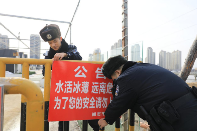 “这一区域冰层开裂严重,还是下江口,要加装警示标识。”在尚志市沿江岸边,尚志市公安局民警正在安装警示标志牌。
