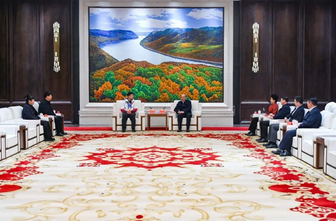 16日,黑龙江省委书记许勤、黑龙江省长梁惠玲在哈尔滨会见凯旋归来的第25届米兰冬奥会速度滑冰男子1500米冠军宁忠岩。