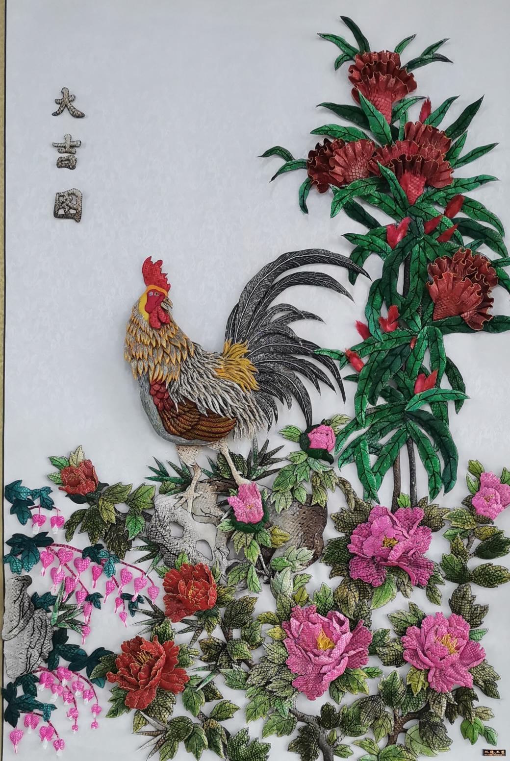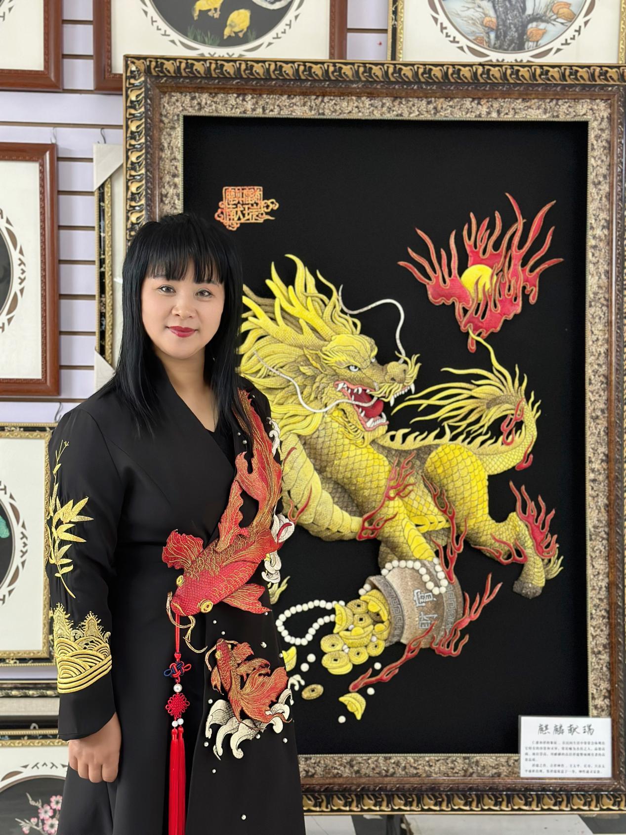 “我从小跟随母亲剪纸,剪工、绣花都不成问题。”2011年,因陪读来到同江的杨双艳,为改善生计接触鱼皮画,她敏锐地找到了两者结合的路径。她打破鱼皮画传统的粗犷风格,运用剪纸的“阴刻”“阳刻”技法,让画面层次更丰富;又将龙凤、松鹤等汉族吉祥题材与赫哲族图腾融合,创作出符合大众审美的作品,团队先后成功研制“鱼皮刺绣”和“掐丝鱼皮”,让这项技艺在色泽与样式上不断升华。创新从未停止,产品的种类、样式越来越多,她的鱼皮饰品成为了游客到同江旅游的伴手礼,大幅的鱼皮画最远销售到美国。